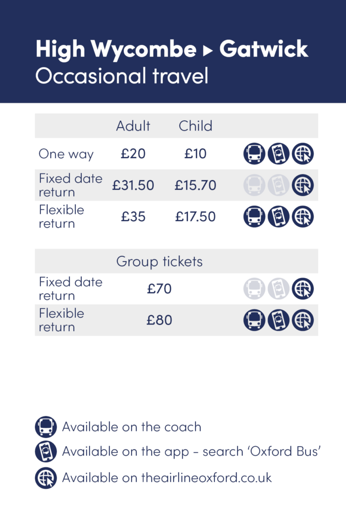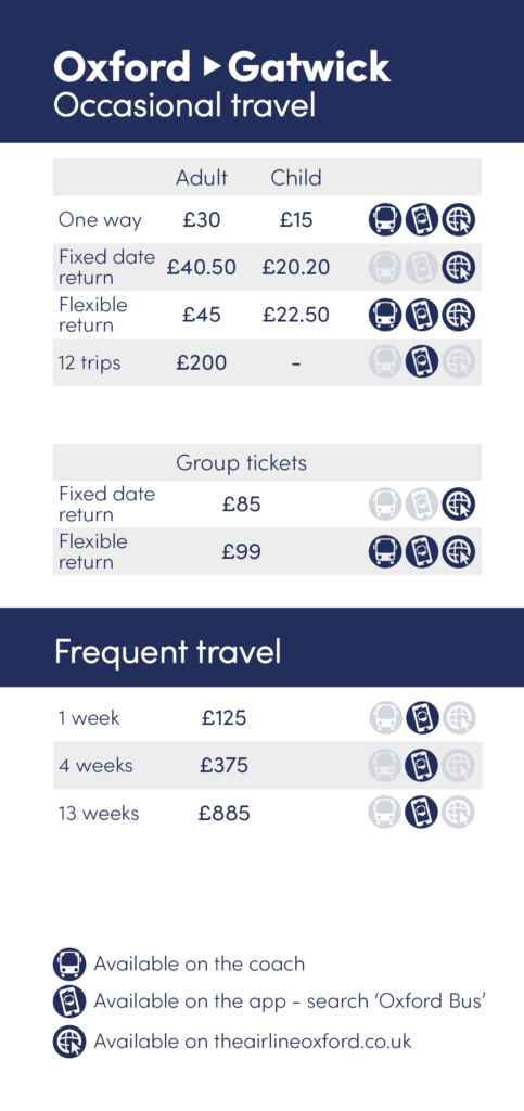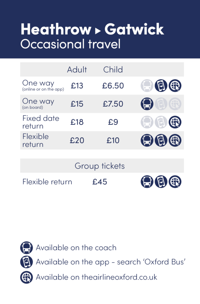 Gatwick time-based products (e.g. 1 week, 4 week etc) also include travel on Heathrow services as well as local Oxford Bus Company and Thames Travel services within cityzone and South Oxfordshire Zone.