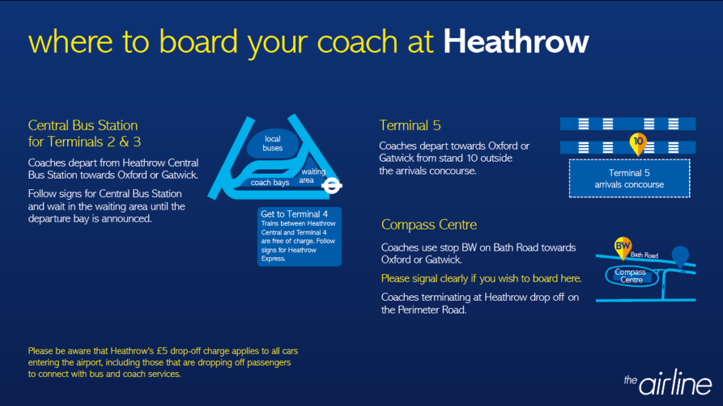 Using Terminal 5? Our airline coach leaves from stand 10 at the arrivals concourse to take you to Oxford.