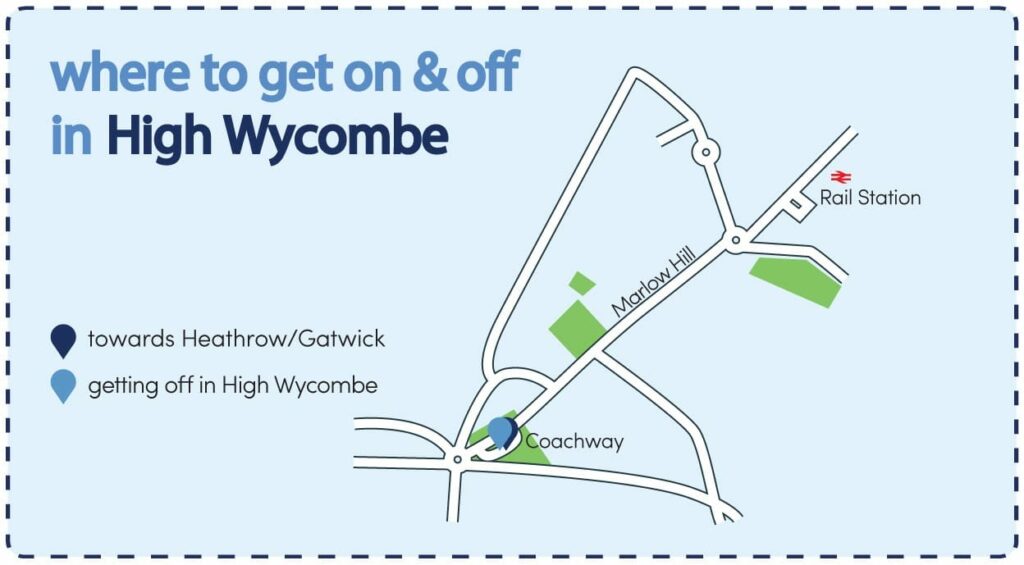 The coach stop (for travel towards the airports) is located just off the M40, near the village of Lewknor. Please see the map below for more information.