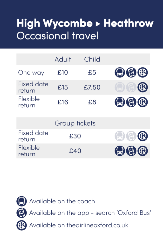 - High Wycombe – Heathrow Colleague Carnet: 12 single trips for £70 – 38% less than buying return tickets on the coach.