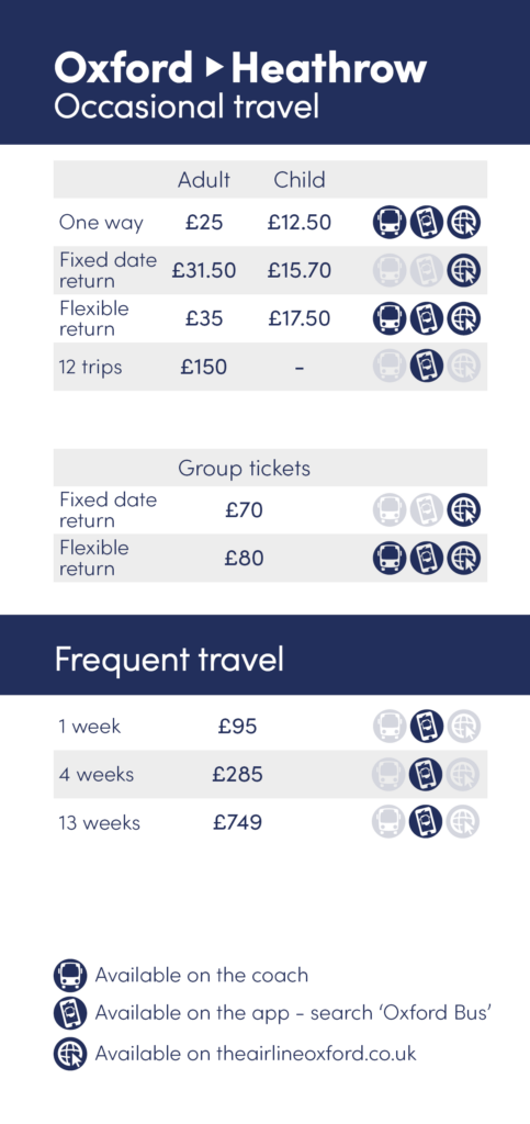 - Oxford – Heathrow Colleague Carnet: 12 single trips for £90 – 57% less than buying return tickets on the coach.